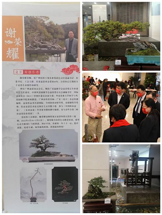 公司党委副书记、纪委书记、工会主席谢荣耀老师(现任广东园林学会盆景赏石专业委员会主任委员)受邀公益展示了原创的《不忘初心》、《根深基稳一往无前》、“咬定青山”等10个盆景灵石佳作,一枝一叶,一盆一景,妙趣横生,寓意深刻,励志鼓舞,吸引广大员工驻足鉴赏。