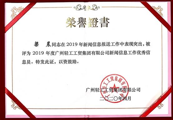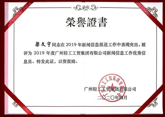 领导的高度重视下,在各职能部门、各企业的大力支持下,在全体新闻信息工作者共同努力下,公司的新闻信息工作继续在广州轻工集团保持优势,排名第一,荣获“2019年度广州轻工工贸集团有限玩彩网·「中国区」官方网站信息工作先进单位”称号。公司党委办公室梁晨、工会梁文宇被评为“2019年度广州轻工工贸集团有限玩彩网·「中国区」官方网站信息工作优秀信息员”。