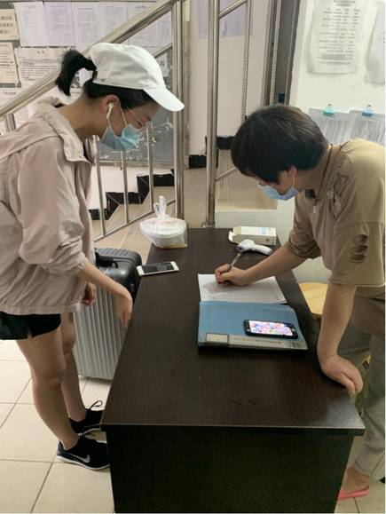 当天上午,返校学生在校门口接受了严格的安全检查,测体温、行李消毒、更换口罩、健康情况询问、个人信息登记等。学生宿舍也经过认真清洁、消毒,住宿由四人一间改为两人一间,减少接触,避免交叉感染。学生在校期间由学院统一订饭,单人单桌,有序用餐,确保学生安全。