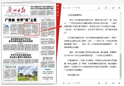 值得一提的是,在6月17日,央视新闻朝闻天下栏目以1分18秒的大篇幅对公司国贸部直播情况进行了报道,随后学习强国--央视网平台也发布了该报道。此外,新快报6月16日、6月17日连续两天在重要版面的显耀位置对我们的直播及参展情况做了详细介绍。