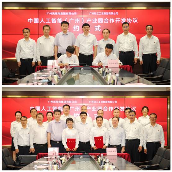 属下广纺联党总支书记、董事长周逊姜和广州无线电集团党委委员、副总经理兼广电新兴产业园公司董事长钱喆分别代表广州轻工集团、广州无线电集团签署了中国人工智能(广州)产业园合作开发协议。