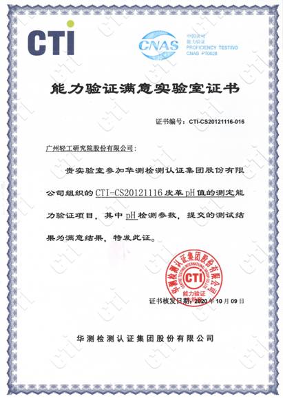 广州轻工研究院股份有限公司今年9月份参加由华测检测认证集团股份有限公司组织的2020年中国合格评定国家认可委员会(CNAS)认可的能力验证项目“皮革pH值的测定”,结果满意!