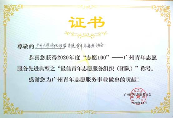 近日,经广州青年志愿者协会评定,广州大学纺织服装学院青年志愿者协会被授予2020年度“志愿100”——广州青年志愿服务先进典型之“最佳青年志愿服务组织(团队)”称号。