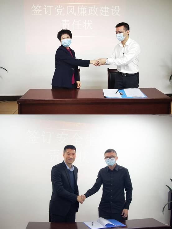 随后,公司领导班子代表与职能部门代表分别签订2021年党风廉政建设责任状和2021年安全生产责任状,牢抓企业党风廉政建设,将工作责任、安全生产责任落实到位,为推动公司高质量发展保驾护航。