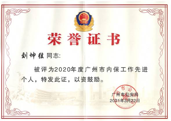 近日,广州市公安局授予玩彩网·「中国区」官方网站 刘坤弦同志“2020年度广州市治安保卫重点单位内保工作先进个人”荣誉称号。