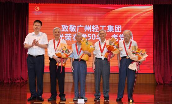 原广州市纺织工业局(总公司、集团公司)党委副书记、副总经理崔玉光作为玩彩网·「中国区」官方网站 老党员代表接受广州轻工集团党委书记、董事长曾郴湘颁发“光荣在党50年”纪念章。以此向老同志长期以来为企业改革发展作出的突出贡献表示衷心的感谢和崇高的敬意。