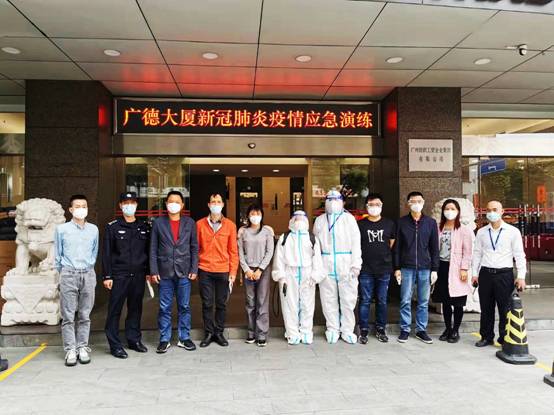 11点02分国贸部启动应急预案,防疫隔离组人员穿好防护服前来复核证实异常后,迅速通过专用电梯转移到广德大厦一楼临时隔离点进行隔离。同时通信联络组第一时间通知社区三人小组和环境消杀组进行环境消杀工作。
