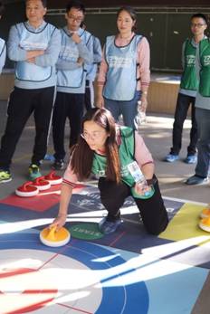 下午,团队旱地冰壶竞赛压轴登场。首先由教练对“旱地冰壶”运动起源、玩法、积分规则等进行讲解。随后各队单独练习,八队车轮战正式拉开序幕。在每场对决中,队员们都全力以赴、集思广益,积极投入和默契配合一个都不少,比分上你追我赶,整个场面热闹非凡。