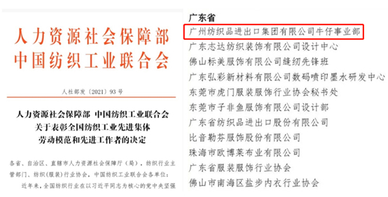近日人力资源社会保障部、中国纺织工业联合会发布了《关于<表彰全国纺织工业先进集体劳动模范和先进工作者的决定>》,广州纺织品进出口集团有限公司牛仔事业部荣获“全国纺织工业先进集体”称号!
