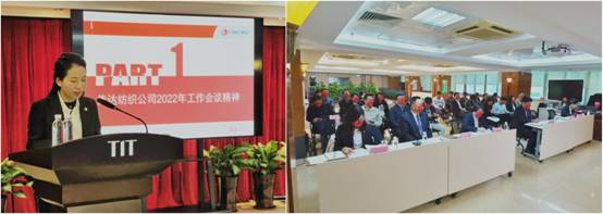 最后,简玮仪发表重要讲话。她对纺出公司2021年克服困难,同心协力取得的成绩表示了肯定,同时提出了相关要求:一是要坚持党建引领,发挥组织优势;二是要“稳中求进”,处理好“稳”和“进”的关系,坚持做大做强主业;三是要紧紧围绕业务开展管理,做好业务开展和风险防控之间的平衡,业务部门要树牢合规经营意识,职能部门要增强服务意识,提升服务水平。她希望,2022年,纺出公司在国际环境仍不乐观的形势下,积极发扬艰苦奋斗的二次创业精神,解放思想,改革创新,实现“发展才是硬道理”!