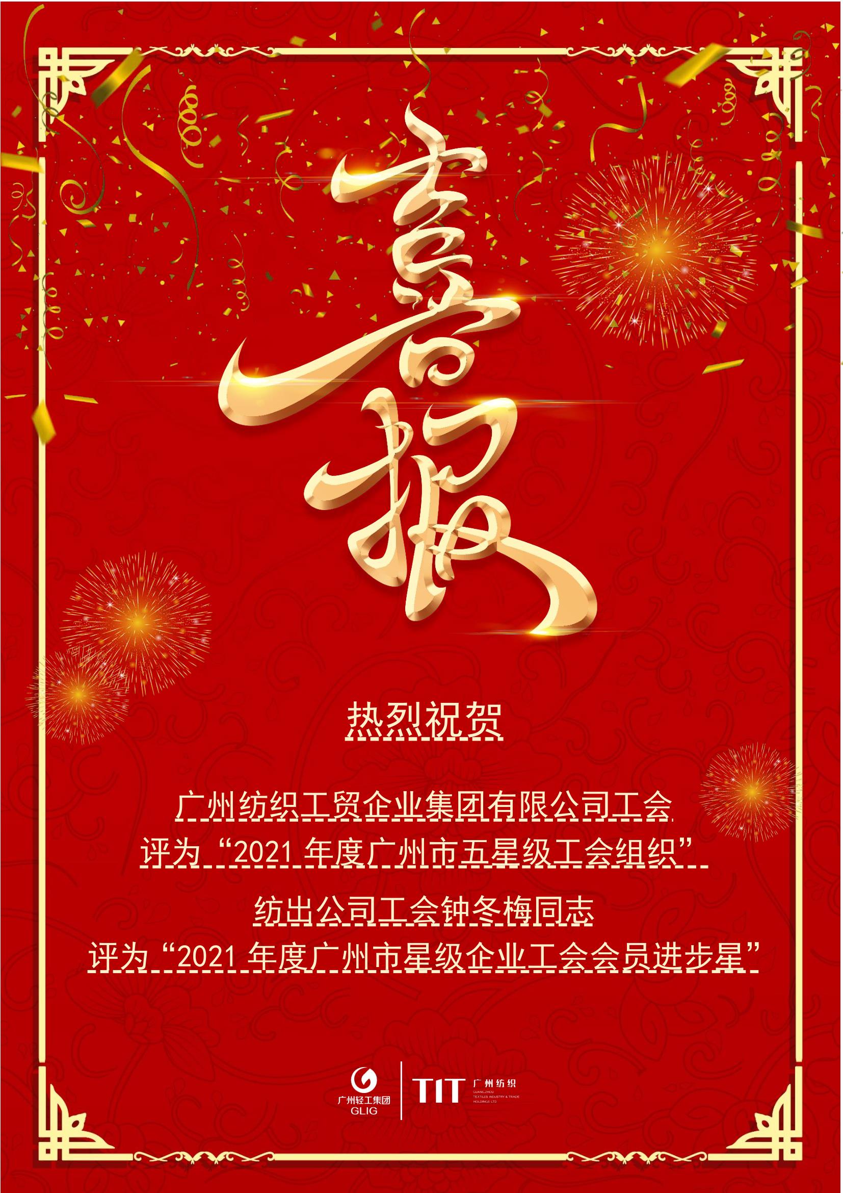 喜报:热烈祝贺玩彩网·「中国区」官方网站 有限公司工会评为“2021年度广州市五星级工会组织”、纺出工会钟冬梅同志评为“2021年度广州市星级企业工会会员进步星”