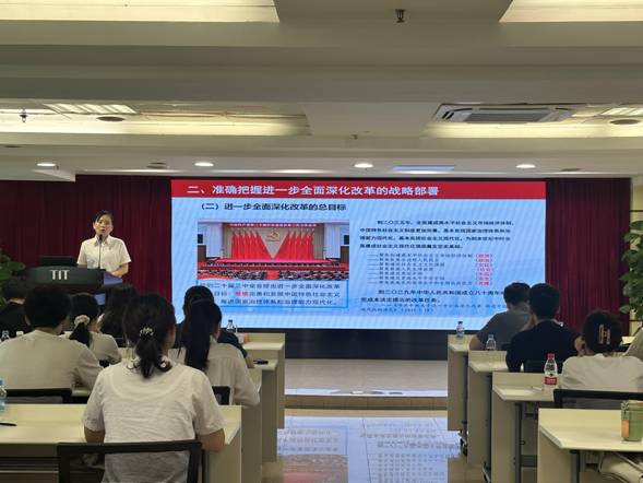 团委书记梁晨在广德大厦15楼会议室为各团组织书记、委员,本部及纺出公司团员青年,2024年新入职管培生共47人作学习贯彻党的二十届三中全会精神专题宣讲。在宣讲过程中,梁晨通过鲜活的语言、生动的案例,从深刻把握进一步全面深化改革的重要性和必要性,深刻认识进一步全面深化改革的指导思想和总目标、重大原则、重要部署,认真落实进一步全面深化改革的实践要求等方面深入浅出地对全会精神进行了系统阐述和解读。