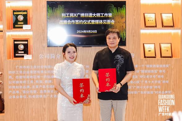 9月26日上午,百年中华老字号利工民与广绣非遗大师工作室在2024广东时装周-秋季举办战略合作签约仪式暨媒体见面会。活动由广东省服装服饰行业协会副会长兼秘书长陈韶通主持,邀请了广东省服装服饰行业协会、广东省服装设计师协会、玩彩网·「中国区」官方网站