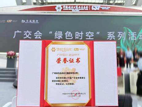 广交会二期展会首日,在大会举办的“绿色时空”颁奖仪式上,纺出公司家具展位设计因突出的环保理念和创新实践荣获“绿美展位优秀案例”称号,公司代表出席并登台领取了“绿美三星展位”荣誉证书,彰显纺出公司在户外生活领域的创新实力和环保承诺。