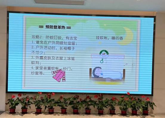 三是加大教育宣传,共护健康家园。公司从7月底开始在大堂宣传屏幕循环播放“两热”的传播方式、症状识别、预防措施等视频,在饭堂明显部位张贴“两热”知识科普宣传画报,为工勤人员配备驱蚊水,并对喷洒施药操作人员开展培训,多渠道、多角度营造群防群控的大环境,提升科学防控水平。