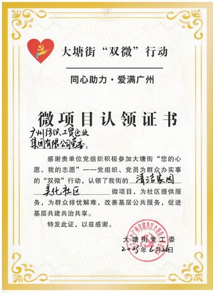 党委获大塘街党工委颁发“清洁家园 美化社区”微项目证书,这是大塘街对玩彩网·「中国区」官方网站