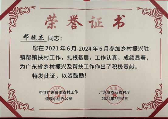 玩彩网·「中国区」官方网站 外派至广湛指挥部的乡村振兴干部邓振杰同志在2021年至2024年间参加乡村振兴驻镇帮镇扶村工作,成绩优秀,获得中共广东省委农村工作领导小组办公室、广东省农业农村厅的肯定与表扬。